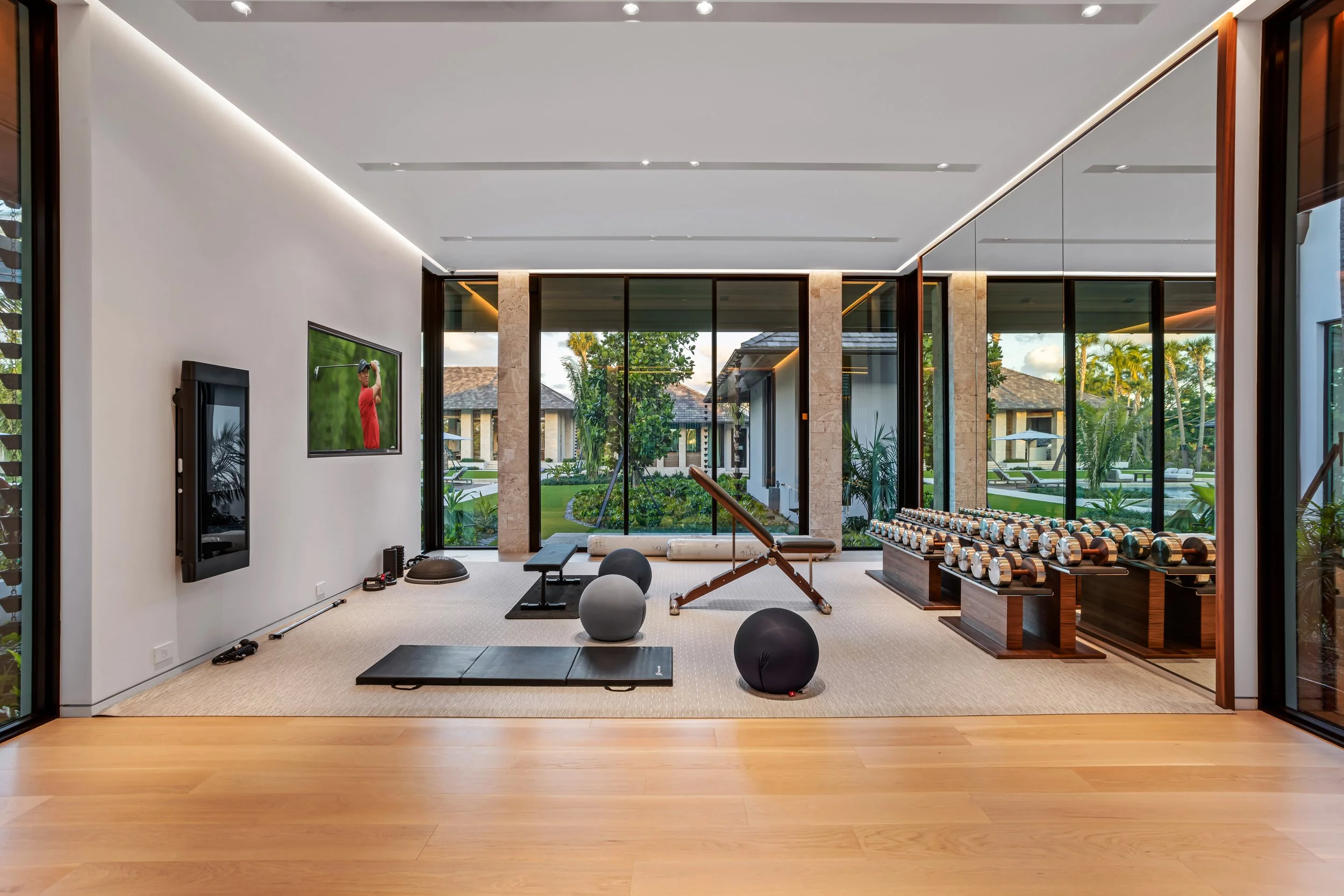 A full-scale home gym allows for strength training, cardio, and functional workouts without compromise. These spaces are thoughtfully designed with reinforced flooring, mirrored walls, acoustic considerations, and integrated audio-visual systems.